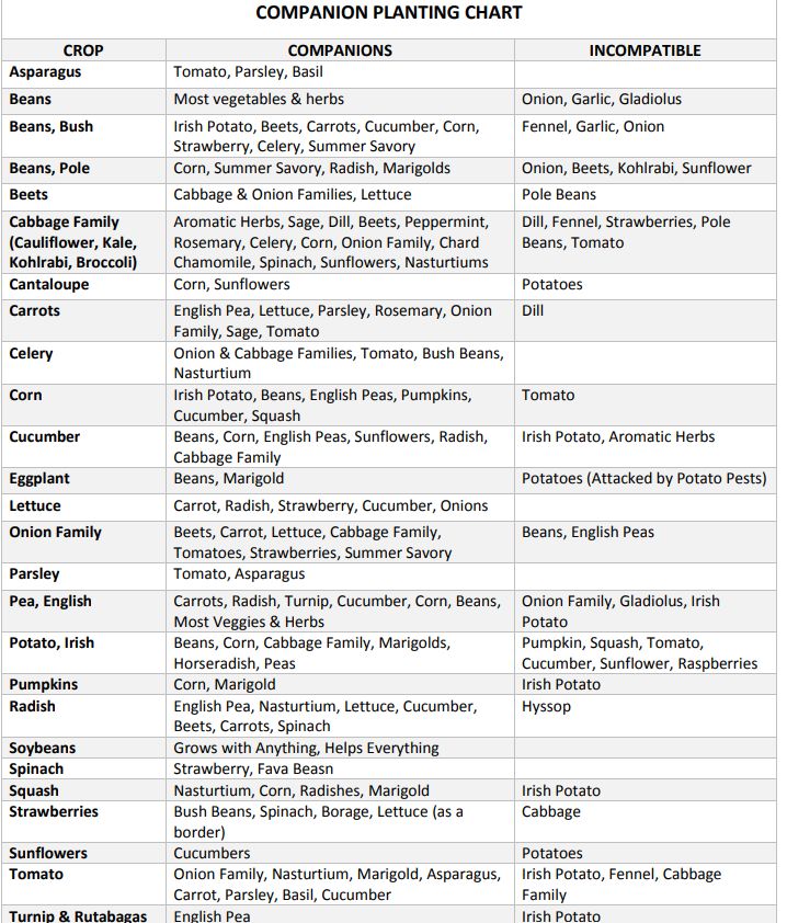Some plant companions also go great together on the dinner table. Some good examples are peppers, tomatoes, basil, onions, and garlic. Tomatoes thrive when alternated with pepper plants. Basil grown close to tomatoes improves the tomatoes’ flavor. Onions and garlic can be grown close by these companions, but they’re usually planted in fall and harvested the following spring. They may be ready to harvest right around when tomatoes and peppers are ready to go in the ground.